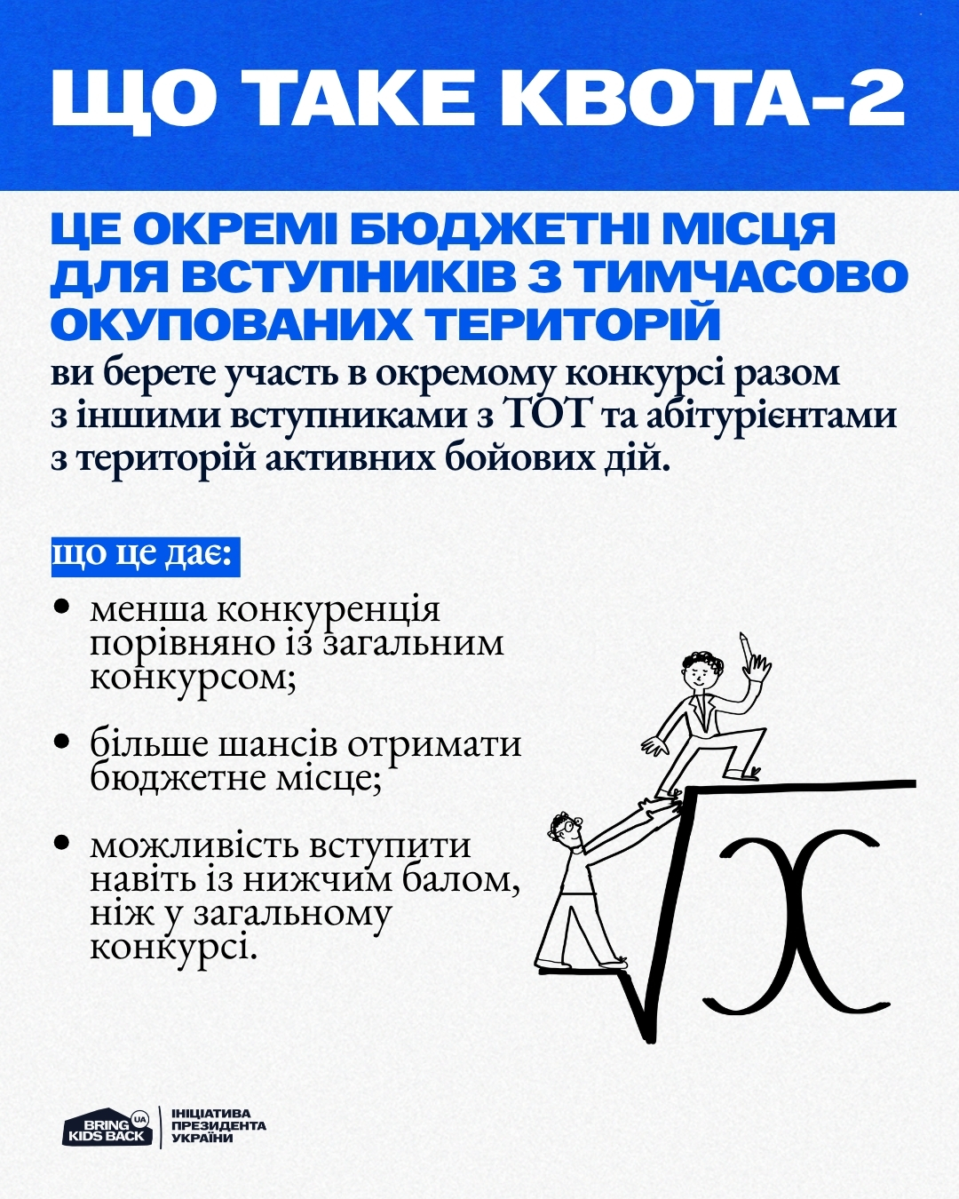 Квота-2 передбачає окремий конкурс на бюджетні місця: у ньому беруть участь вступники з ТОТ та територій активних бойових дій. У більшості університетів це 10% місць (але не менше одного), а в переміщених ЗВО — до 40%.