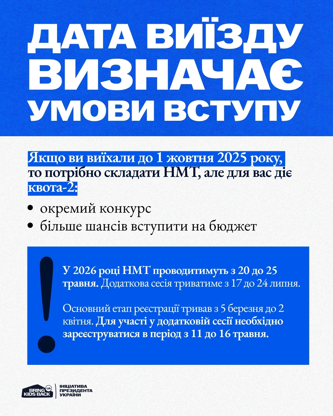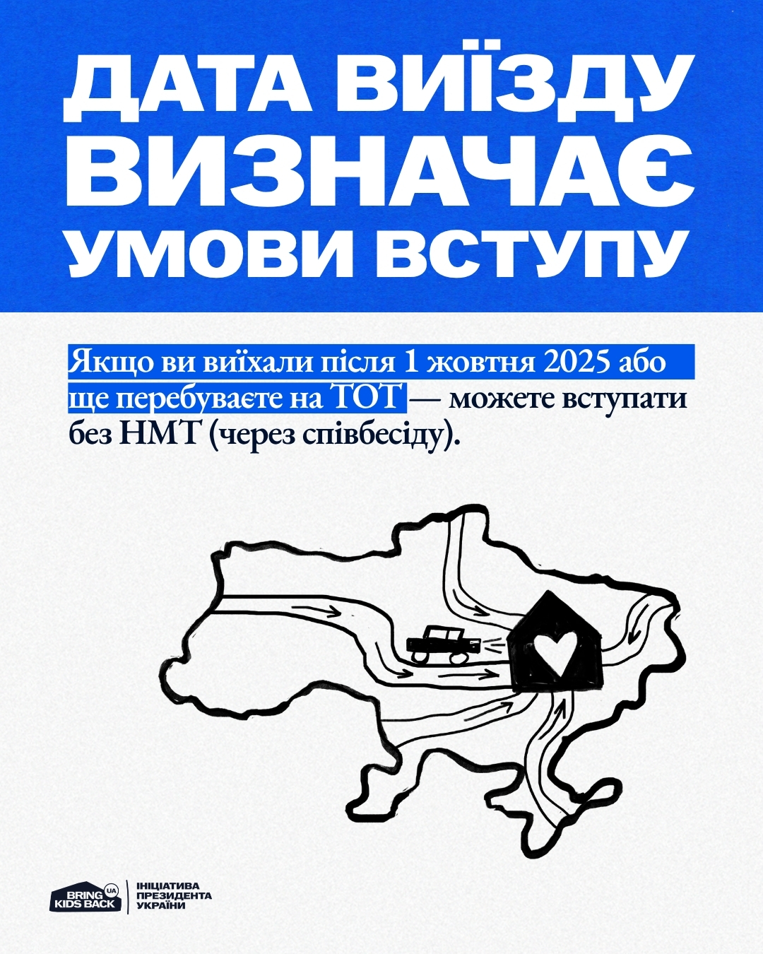 Вступникам із ТОТ не обов’язково складати НМТ — можна пройти співбесіду в закладі освіти з предметів НМТ. Якщо виїзд відбувся після 1 жовтня 2025 року або людина досі перебуває на ТОТ — вступ можливий без НМТ. Якщо ж виїзд був раніше — потрібні результати тесту, але діє квота-2.